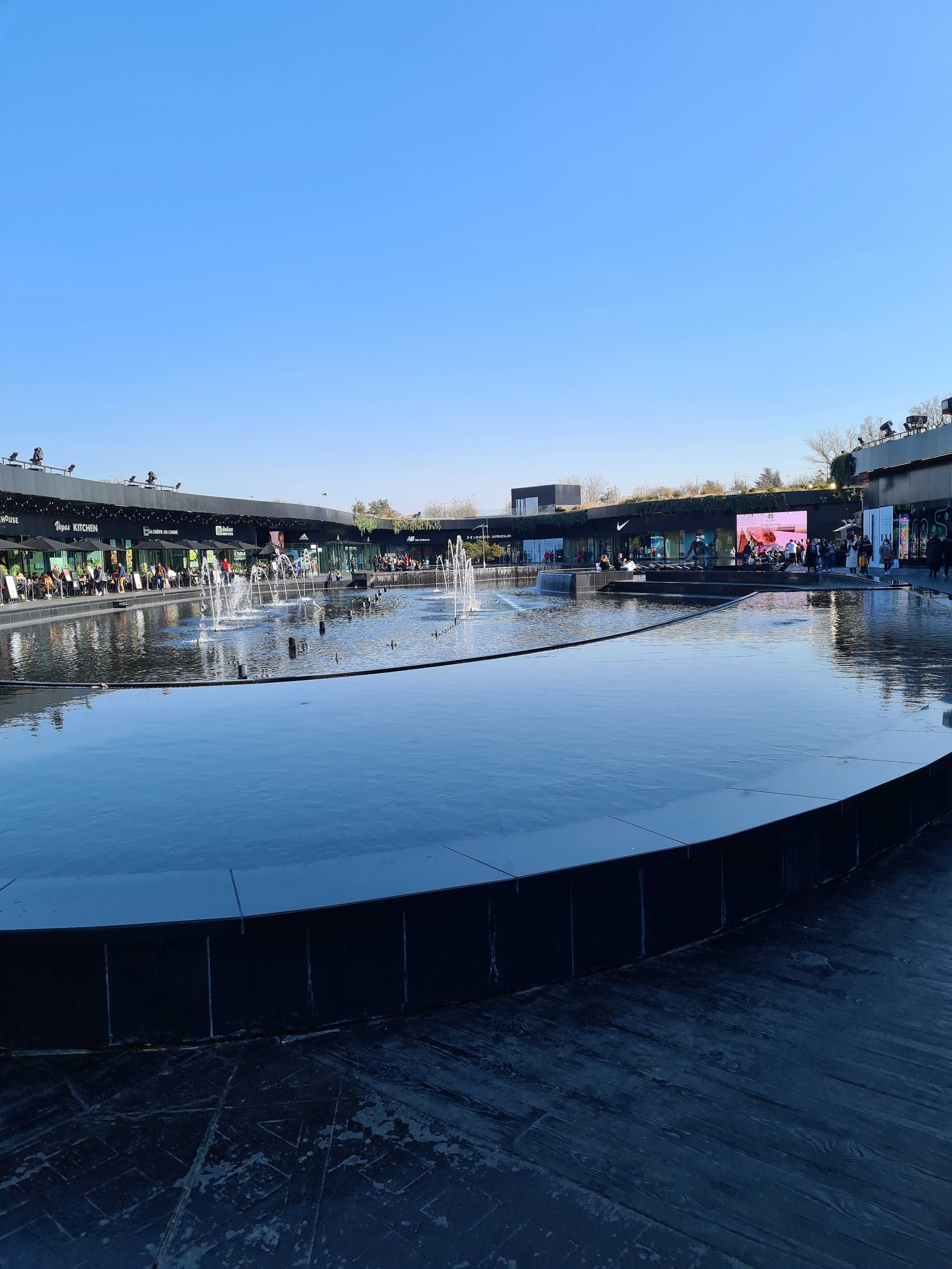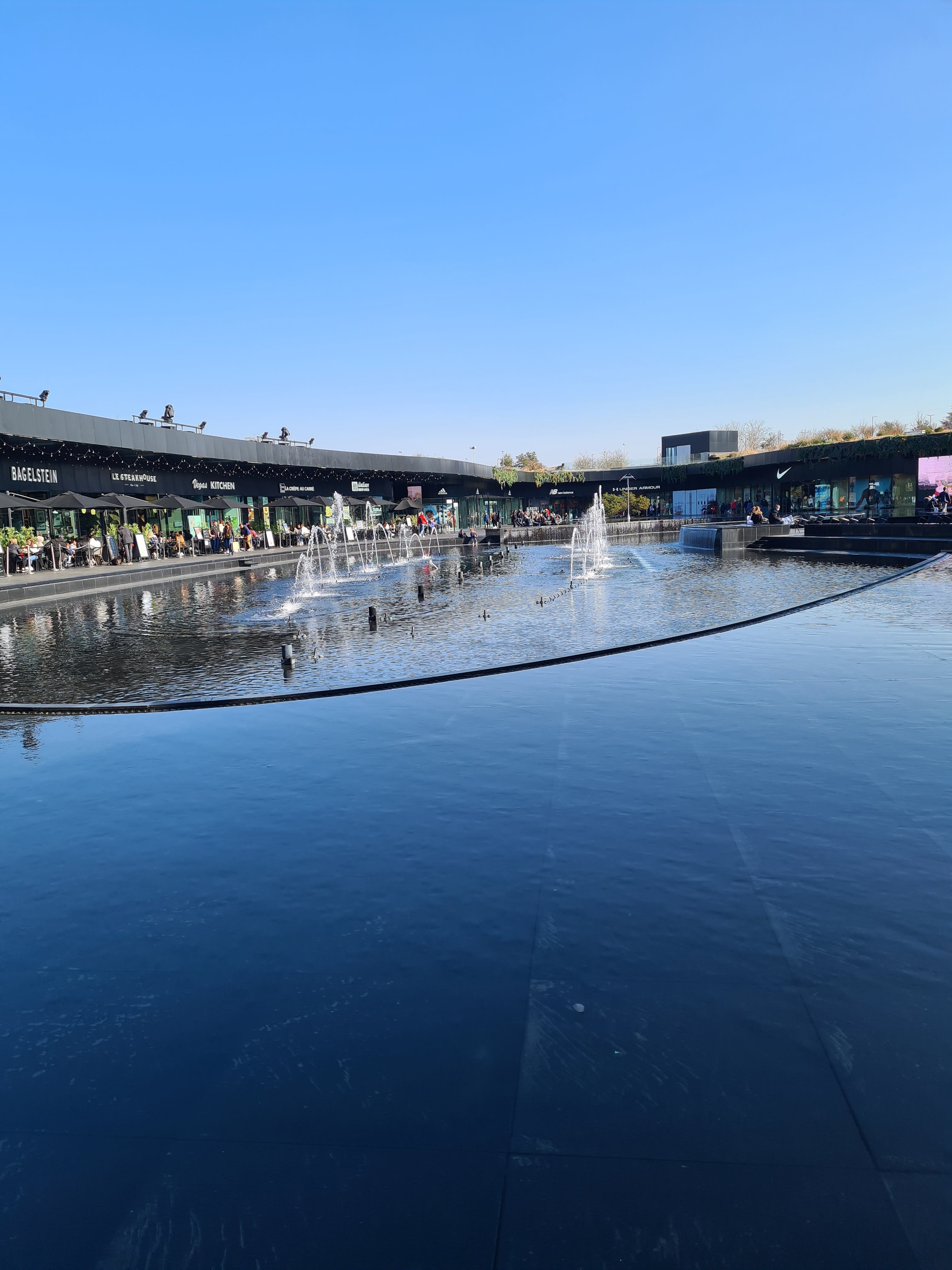 J adore ! Une centaine d enseignes commerciales de renom bien moins chères que partout ailleurs rien que pour nous. Toutes regroupées dans un décor magnifique ! On s y sent vraiment bien au milieu des fontaines même pour boire un café ou dévorer une pizza... Parking gratuit abrité. Je recommande chaudement.....